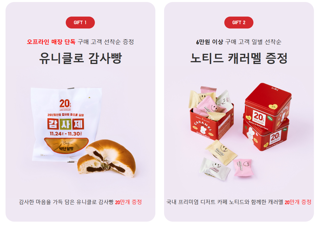 1. 오프라인 매장 단독 "감사빵" : 구매 고객 선착순 증정(20만개)